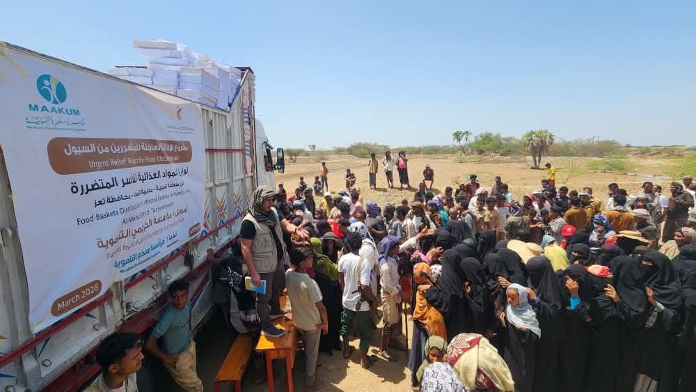 - مؤسسة معكم التنموية تختتم توزيع 300 سلة غذائية للمتضررين من السيول في منطقة النجيبة بمديرية المخا بمحافظة تعز بتمويل كريم من مؤسسة الكريمي التنموية