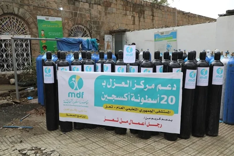 تعز .. ضمن جهود قطاع الصحة بمؤسسة معكم التنموية mdf لمواجهة COVID19 بتعز تم دعم مركز العزل الصحي بالمستشفى الجمهوري بتعز ب ٢٠ أسطوانة أكسجين بتمويل من رجل أعمال من تعز.