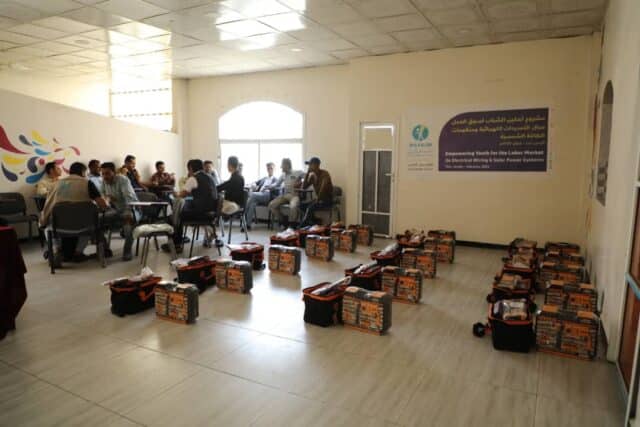 بعد تدريب(16) شابا واكسابهم المهارات المهنية في مجال التمديدات الكهربائية وتركيب منظومة الطاقة الشمسية.. تم اليوم تمكينهم من خلال تسليمهم وتمليكهم المعدات الخاصة بالمهنة،