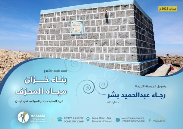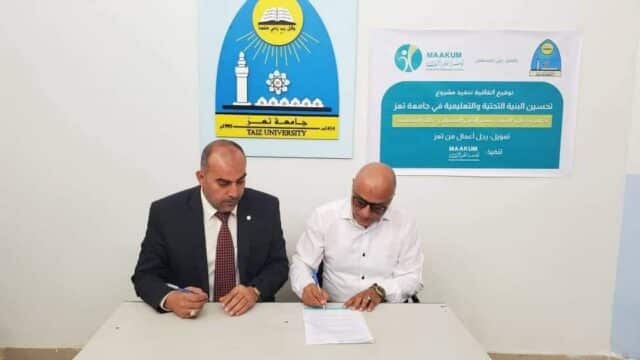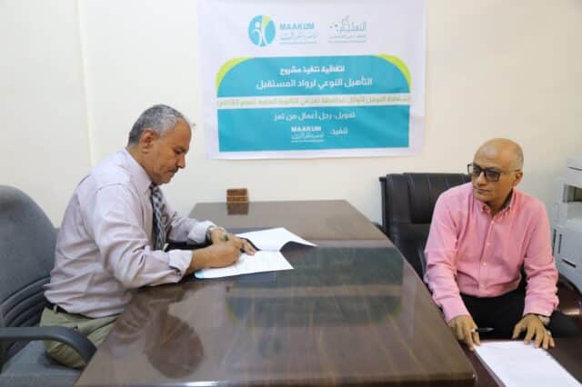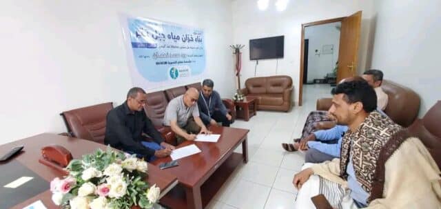 رئيس مؤسسة MAAKUM الدكتور عبدالحميد اليوسفي يوقع مع مدير مديرية جبل حبشي المحامي فارس المليكي اتفاقية لتمويل بناء خزان مياه جبل تتر بمنطقة وادي البير مديرية جبل حبشي