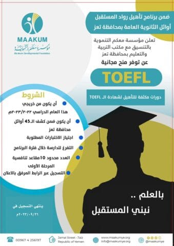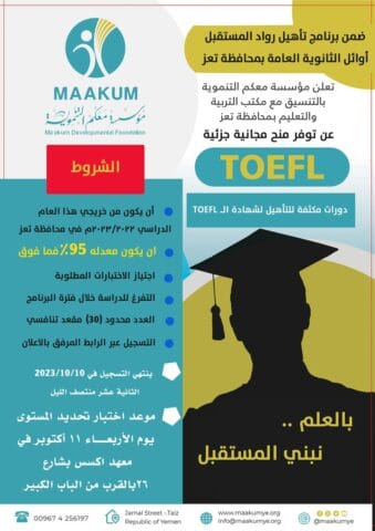 تحت شعار “بالعلم نبني المستقبل” تواصل #مؤسسة_معكم_التنموية تنفيذ مشروع التأهيل النوعي لرواد المستقبل والذي يستهدف تأهيل أوائل محافظة تعز من خريجي الثانوية العامة 2023م في اللغة الانجليزية لنيل شهادة الـ TOFEL