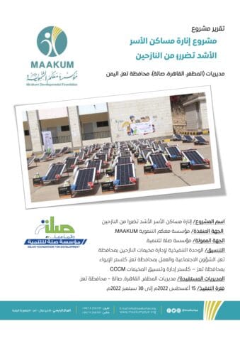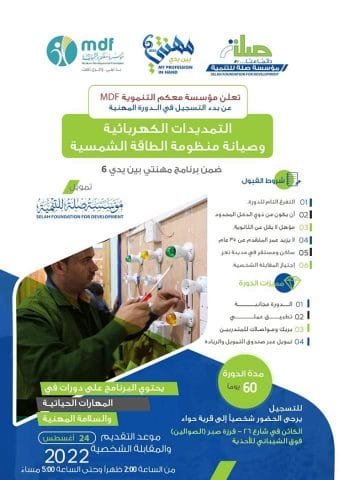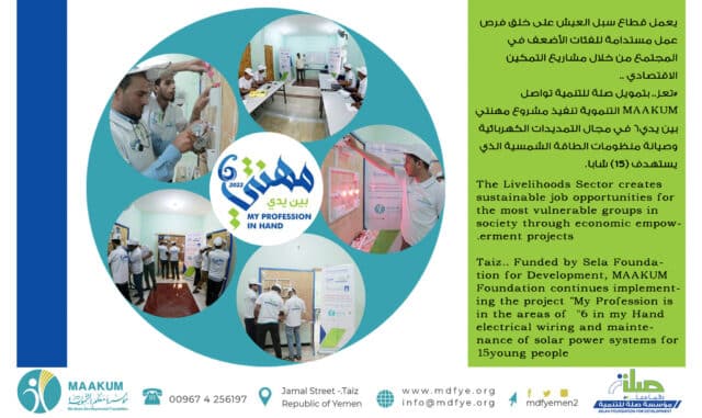 يعمل قطاع سبل العيش على خلق فرص عمل مستدامة للفئات الأضعف في المجتمع من خلال مشاريع التمكين الاقتصادي.. #تعز .. بتمويل صلة للتنمية تواصل MAAKUM التنموية تنفيذ مشروع مهنتي بين يدي٦ في مجال التمديدات الكهربائية وصيانة منظومات الطاقة الشمسية لعدد ١٥ شابا.