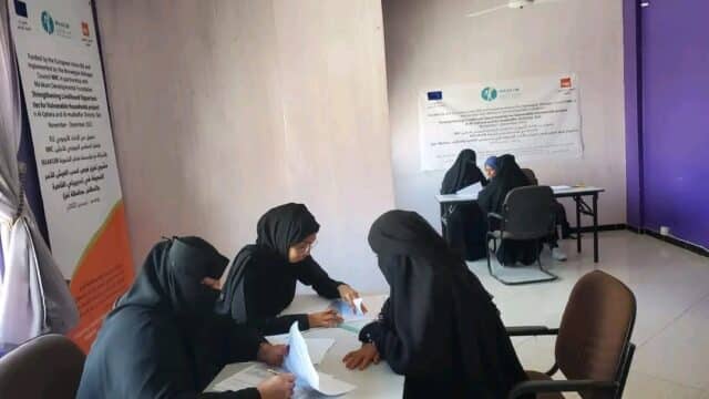 جانب من مقابلة المتقدمات لدورات الخياطة المتقدمة والصناعات الغذائية ضمن مشروع تعزيز فرص كسب العيش للأسر الضعيفة في مديريتي القاهرة والمظفر بمحافظة تعز