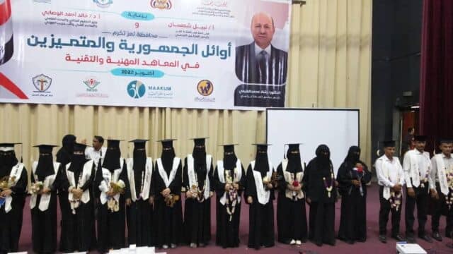 تعز .. ضمن جهود معكم MAAKUM التنموية في دعم التعليم الفني والتدريب المهني وتحفيز الشباب التوجه نحو اكتساب مهارات مهنية تؤمن لهم #سبل _العيش_ والتمكين الاقتصادي،ساهمت المؤسسة في تكريم(32) من أوائل الجمهورية لهذا العام، كما تم تكريم (158) من المتميزين من المعلمين والاداريين والموجهين في المعاهد المهنية والتقنية