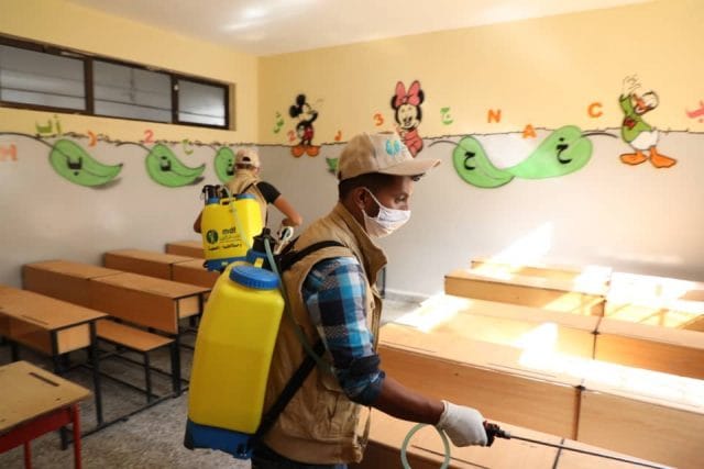 تعز .. تحت شعار نحو بيئة مدرسية صحية ونظيفة .. مؤسسة معكم التنموية mdf تدشن مشروع رش وتعقيم المدارس ..